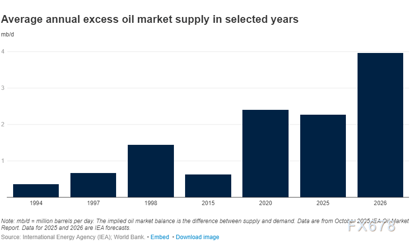 (原油过剩柱状图,2026年原油过剩风险显著提高)