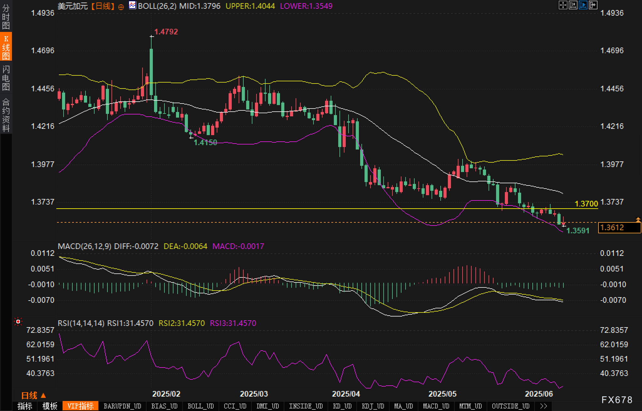 从指标来看,MACD指标维持死叉状态,DIFF与DEA同步向下发散,且MACD柱持续为负,显示空头动能仍占主导。RSI运行于31.45的超卖边缘区域,虽短线或有反弹迹象,但在未突破35以上前,仍难言趋势反转。布林带带口继续扩张,暗示波动率提升,短期或有破位风险。   同时,从均线系统观察,汇价持续承压于短中期均线之下,20日线与60日线均拐头向下,呈现典型的空头排列结构。前期高点1.3700构成明显的短线阻力,分析认为只有有效收复该位,才能缓解当前下行压力。   市场目前情绪结构呈现“避险美元对抗基本面加元”格局。分析认为避险因素虽短期支撑美元,但中期效力仍不及基本面力量,尤其是在加元受油价提振、加拿大央行收紧预期强化的背景下。资金面上,市场并未显著流出加元资产,反而对资源货币出现增配倾向,说明多头并未彻底撤退。   此外,RSI指标接近超卖区,或引发部分短线多头技术性进场,但总体结构仍倾向空头主导。分析认为在地缘冲突未出现升级前,市场风险偏好预计难以彻底扭转。   短期来看,分析认为美元或继续受到地缘政治与贸易不确定性的支撑,但考虑到加拿大央行鹰派立场与油价可能继续上行的趋势,汇价在1.3700下方仍将维持震荡偏弱格局。若后续突破1.3591支撑,则可能开启新一轮下跌行情,测试1.3550乃至1.3500。   中长期维度,在美联储维持高利率同时经济数据趋弱的背景下,美元可能面临结构性回调风险。若加元因原油稳定与经济数据支持进一步升值,则美元/加元有望形成更大级别的下降通道结构。   交易员关注的风险因素包括:地缘事件进一步激化导致美元避险需求持续增强,或加拿大经济数据不及预期造成市场情绪转向,这将可能触发反向行情,令空头防线承压。