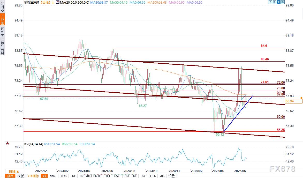 上周末,欧佩克+同意在8月将日产量提高54.8万桶,这一增幅超过了此前三个月达成的41.1万桶/日的增长协议。   欧佩克的这一决定,意味着其正恢复此前220万桶/日自愿减产额度中80%的产量。高盛预计,在8月3日即将召开的欧佩克+会议上,该组织将宣布9月增产55万桶/日。   美国官员已暗示关税生效时间将推迟,但尚未明确说明届时会对税率做出何种调整。这种不确定性将限制油价的上行空间,因为投资者可能会持续担忧经济活动放缓对石油需求前景的影响。   技术分析