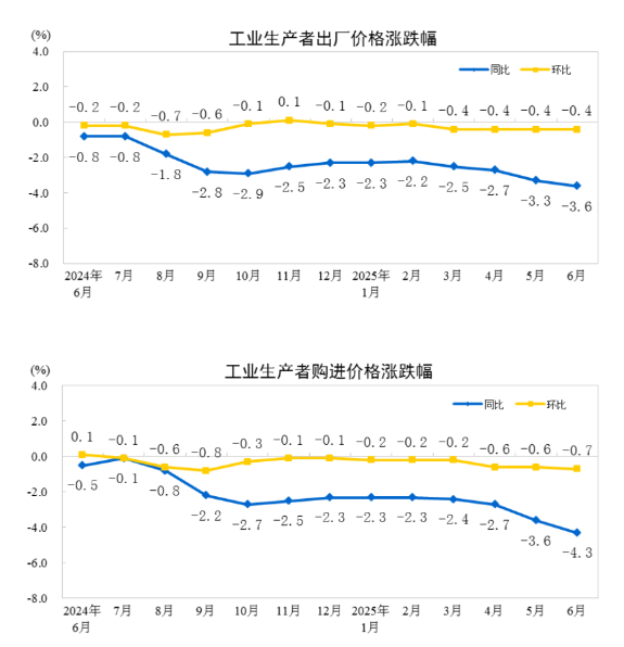 2025年6月份,全国工业生产者出厂价格同比下降3.6%,环比下降0.4%;工业生产者购进价格同比下降4.3%,环比下降0.7%。上半年,工业生产者出厂价格比上年同期下降2.8%,工业生产者购进价格下降2.9%。