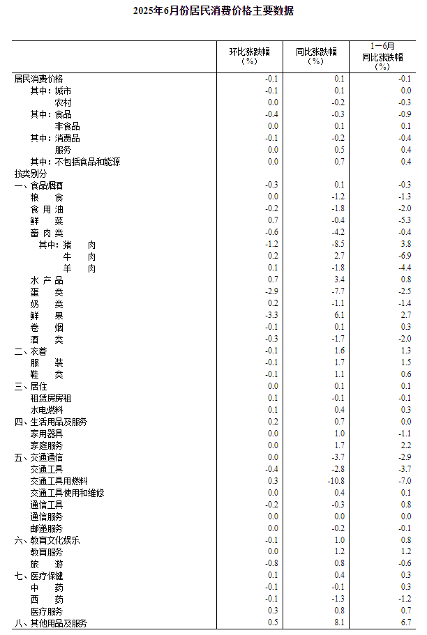 2025年6月份,全国居民消费价格同比上涨0.1%。其中,城市上涨0.1%,农村下降0.2%;食品价格下降0.3%,非食品价格上涨0.1%;消费品价格下降0.2%,服务价格上涨0.5%。上半年,全国居民消费价格比上年同期下降0.1%。