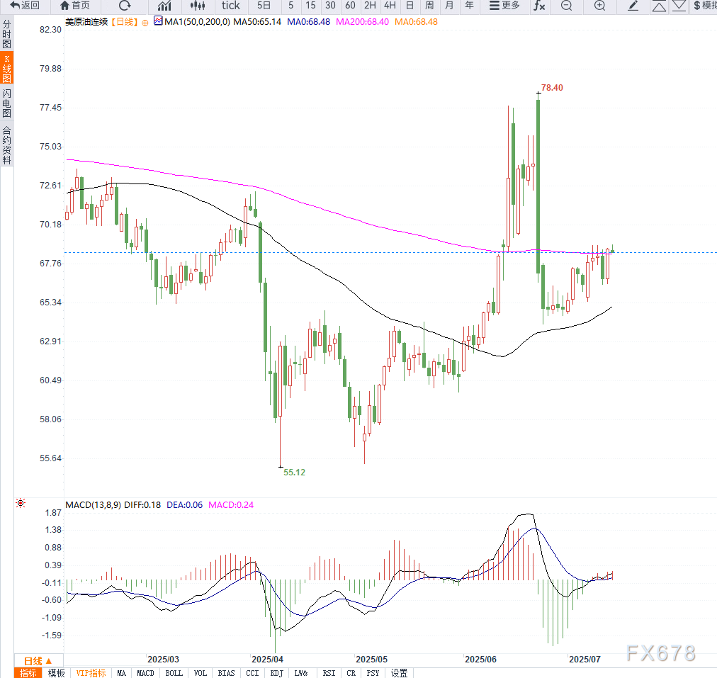 与此同时,欧洲联盟外交官表示,第十八轮对俄制裁即将达成一致,其中包括进一步下调俄油价格上限的提议。   供需面的矛盾也在加剧。据市场调查显示,上周布伦特原油累计上涨3%,WTI涨幅为2.2%。国际能源署(IEA)指出,尽管表面上市场供需看似平衡,但由于夏季炼油高峰和电力需求上升,全球石油实际供应可能比预期更为紧张。   “油市供应紧张的迹象比数字显示的更为显著。”——据IEA报告   不过,沙特超额产量令多头信心受挫。据IEA数据,沙特6月产量达到980万桶/日,超过其OPEC+配额的937万桶/日。   对此,沙特能源部周五回应称,该国已“完全遵守”自愿减产协议,并强调其6月市场原油供应量为935.2万桶/日,与配额保持一致。   “沙特的原油供应量并未违反OPEC+减产共识。”——沙特能源部声明   需求前景方面仍存变数。据ANZ银行分析师指出,市场正在等待亚洲大国即将公布的大宗商品初步贸易数据,以评估该国能源进口是否持续疲软。   此外,美国与多个贸易伙伴之间的关税磋商也成为焦点。若谈判失败,可能对全球经济增速及能源需求构成打击。   WTI原油在日线图上延续自上周低点反弹的走势,目前价格运行于68美元上方,重回5日与10日均线之上,显示短线多头力量增强。MACD指标呈现金叉初步放量,动能柱开始转为正值,预示价格有望挑战前期高位区域(69.50-70.20美元)。   若突破该区间,将确认短期趋势反转,进一步目标将指向72美元一线。若回调,则关注66.80美元支撑位是否有效。