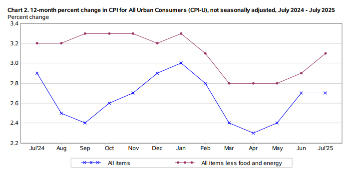 剔除波动较大的食品和能源价格后,7月核心CPI环比上涨0.3%,与预期一致,前一月该数据为0.2%;同比涨幅加速从2.9%至3.1%,高于市场预期的3%,上一次达到这一水平还是在2月份。