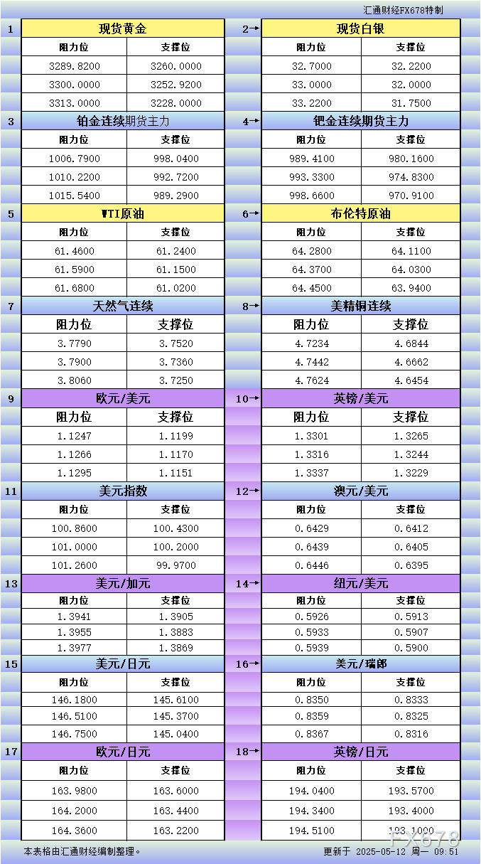 嘉盛中文官网:5月12日亚市更新支撑阻力:18品种支撑阻力(金银铂钯原油天然气铜