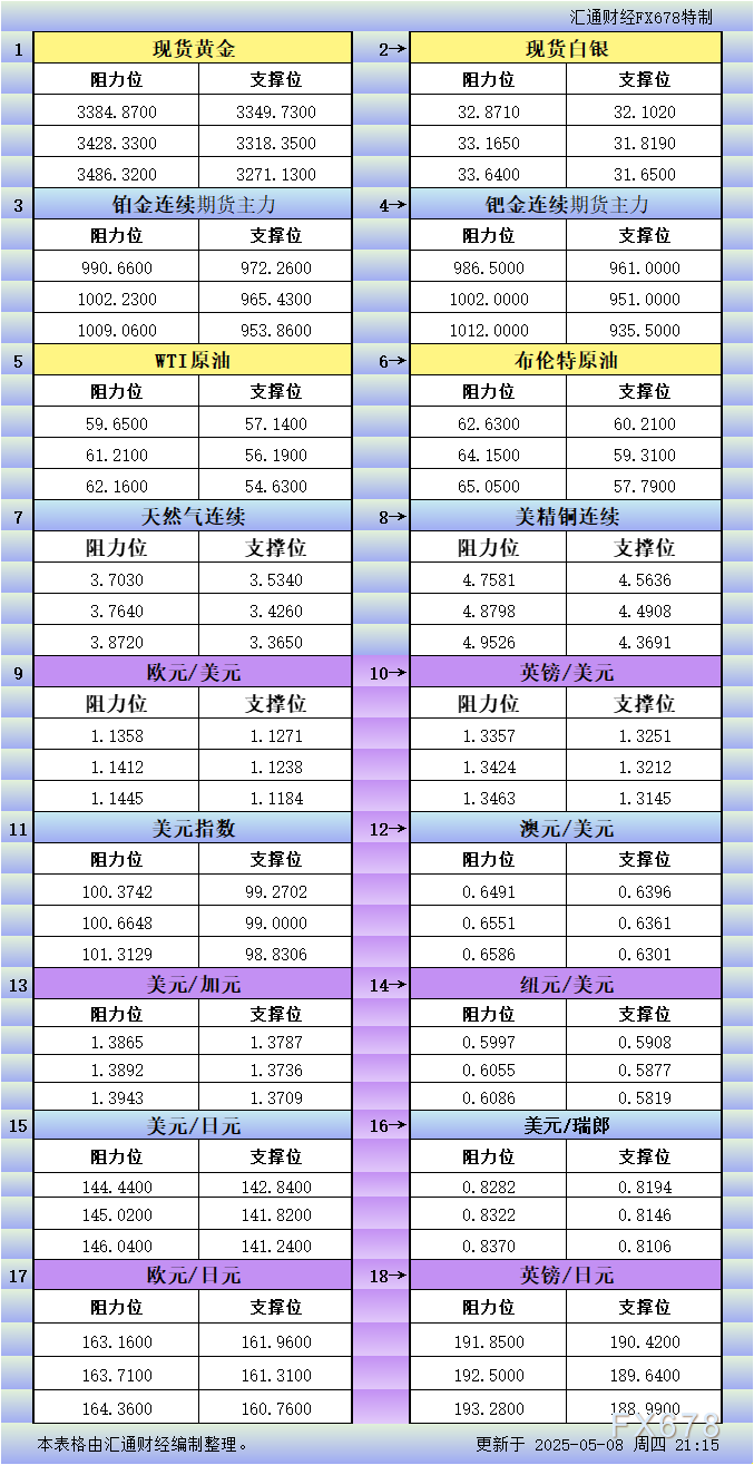 嘉盛外汇官网;5月9日亚市更新支撑阻力:18品种支撑阻力(金银铂钯原油天然气铜及