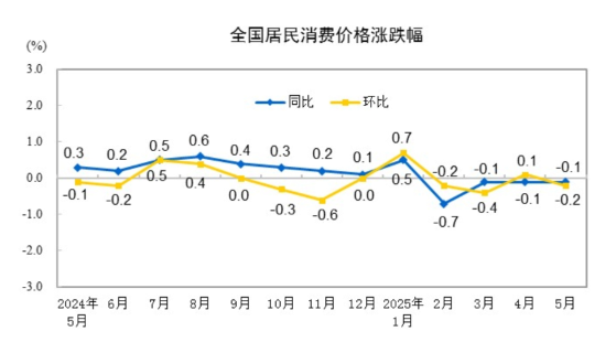 2025年5月份居民消费价格同比下降0.1% 2025年5月份,全国居民消费价格同比下...